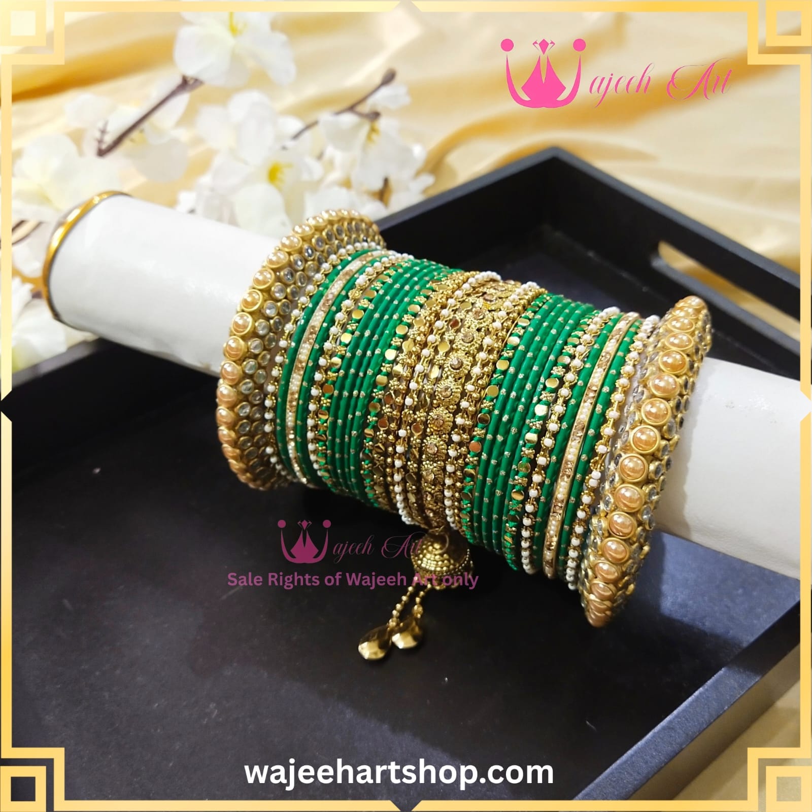 Kbangle459 Green and Golden Tassel Kundan Bangle Set For Eid, Wedding, and Mehndi Functions.